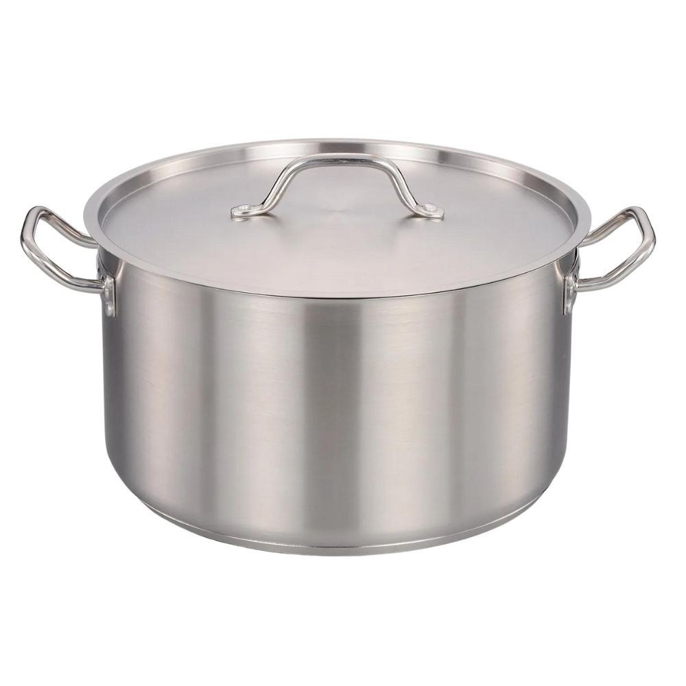 A Panela Inox Fundo Triplo 44,5 Litros Caçarola Alta Zahav 45cm.Possui Fundo Triplo reforçado com três camadas para distribuição uniforme de calor, indicada especialmente para cozinhas industriais.